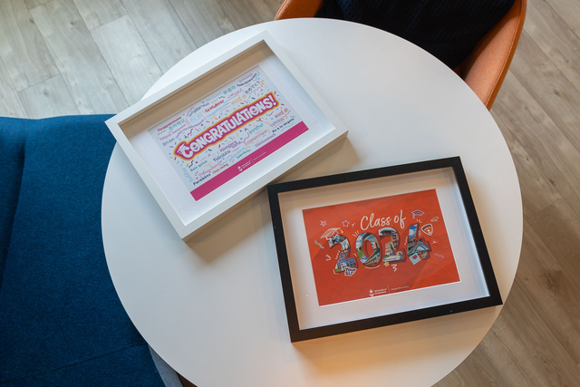 - Exclusive Artwork: unique designs celebrating your graduation designed by student artist Hazel Harpin.